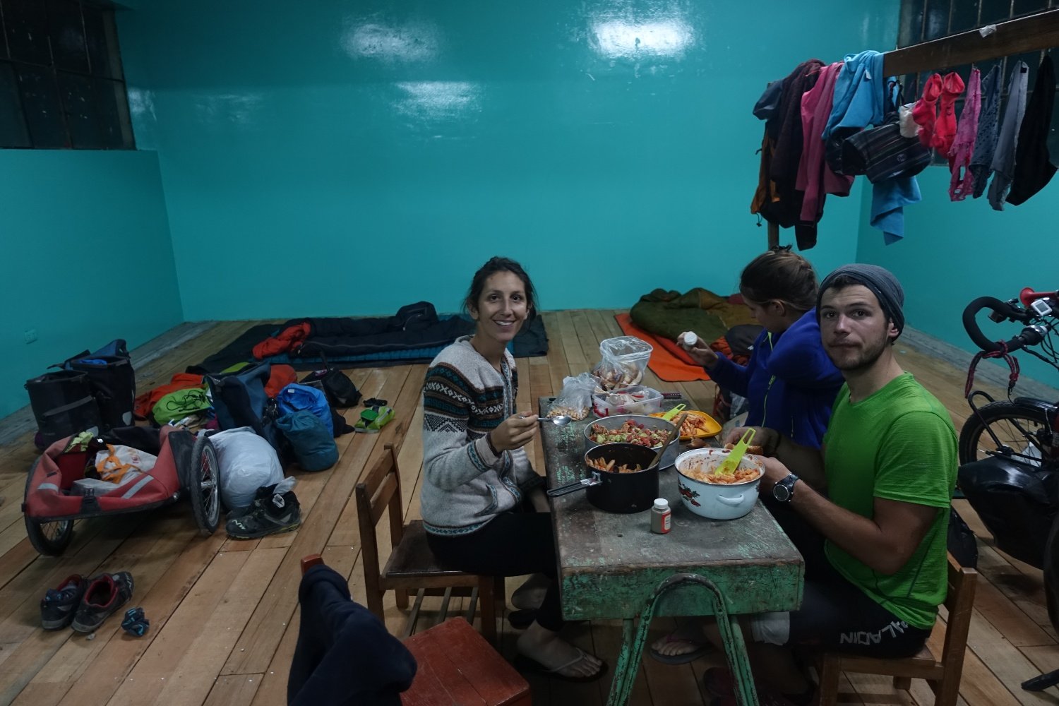 accueil, digne d'un hôtel. On nous propose deux salles différentes pour nous installer, douche chaude, cuisine et Wi-Fi. On profite de notre journée de repos forcé pour faire une soirée