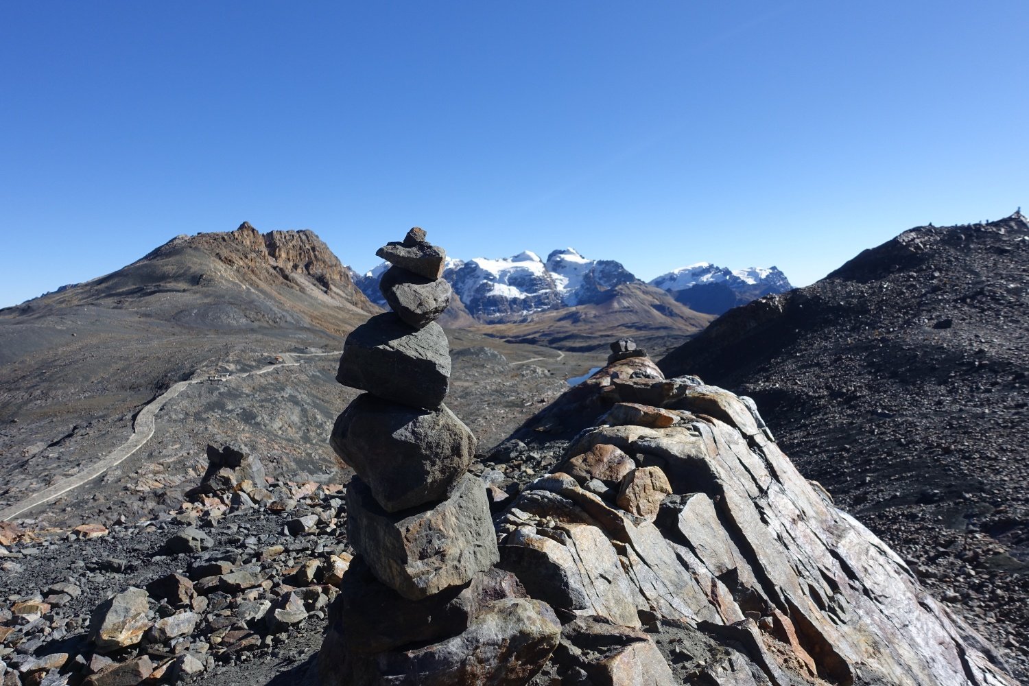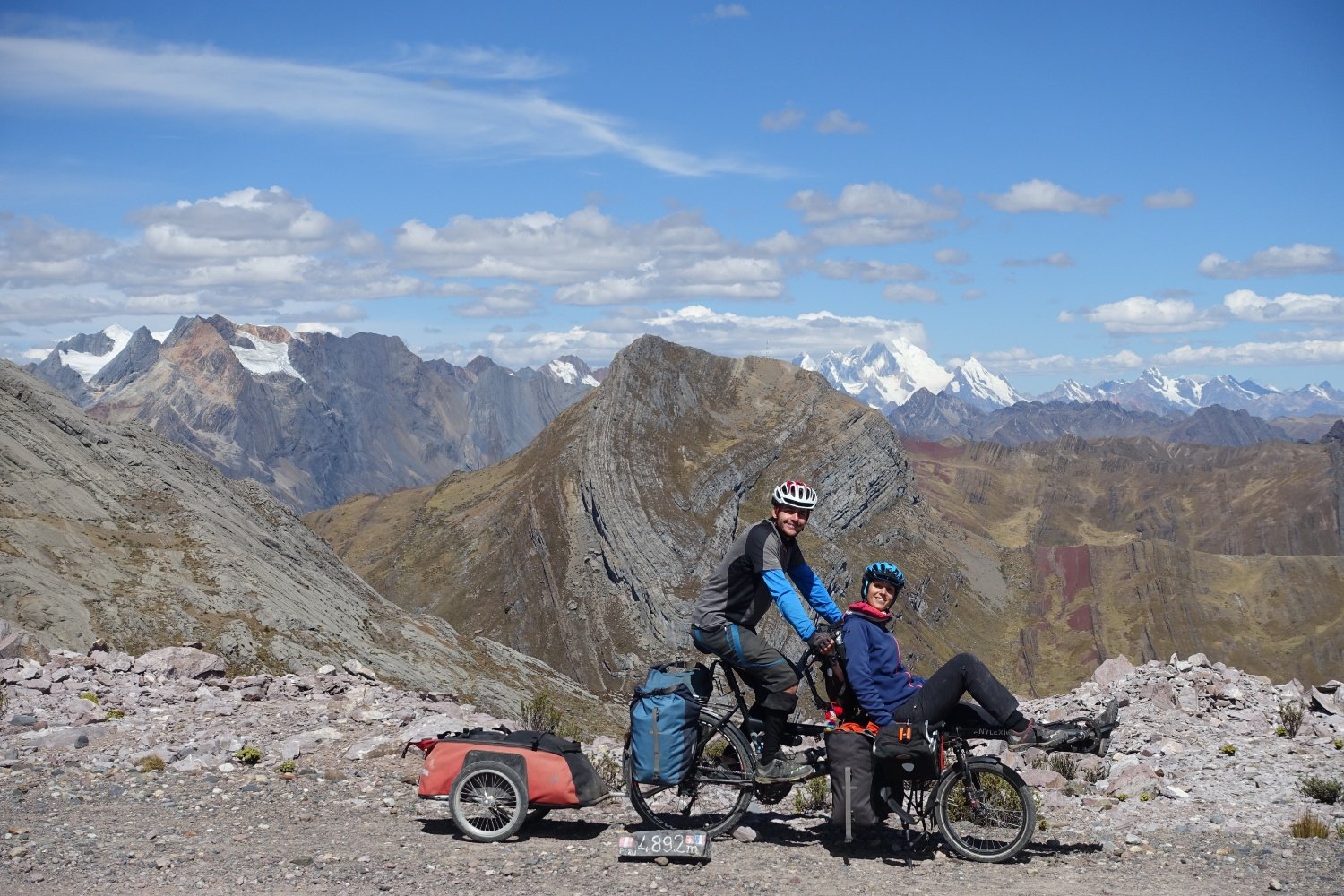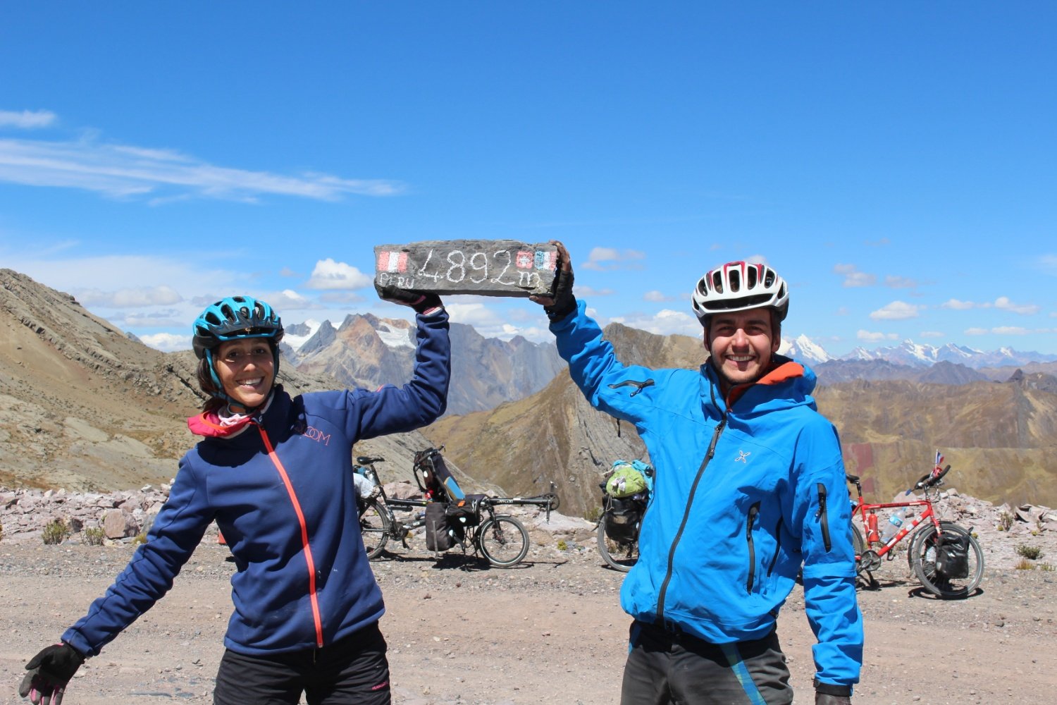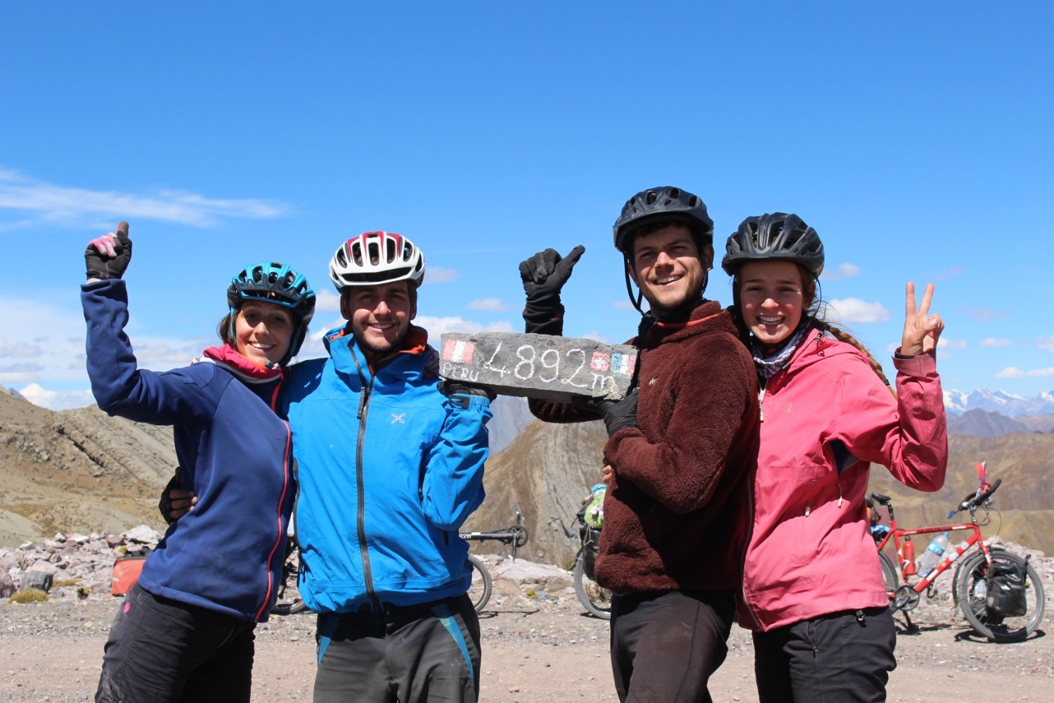 Après une bonne pause repas au sommet. 4892 m, nous sommes fins prêts à repartir pour encore 6 km de montée à près de 5000m d'altitude. L'air manque, le souffle est court, les paysages