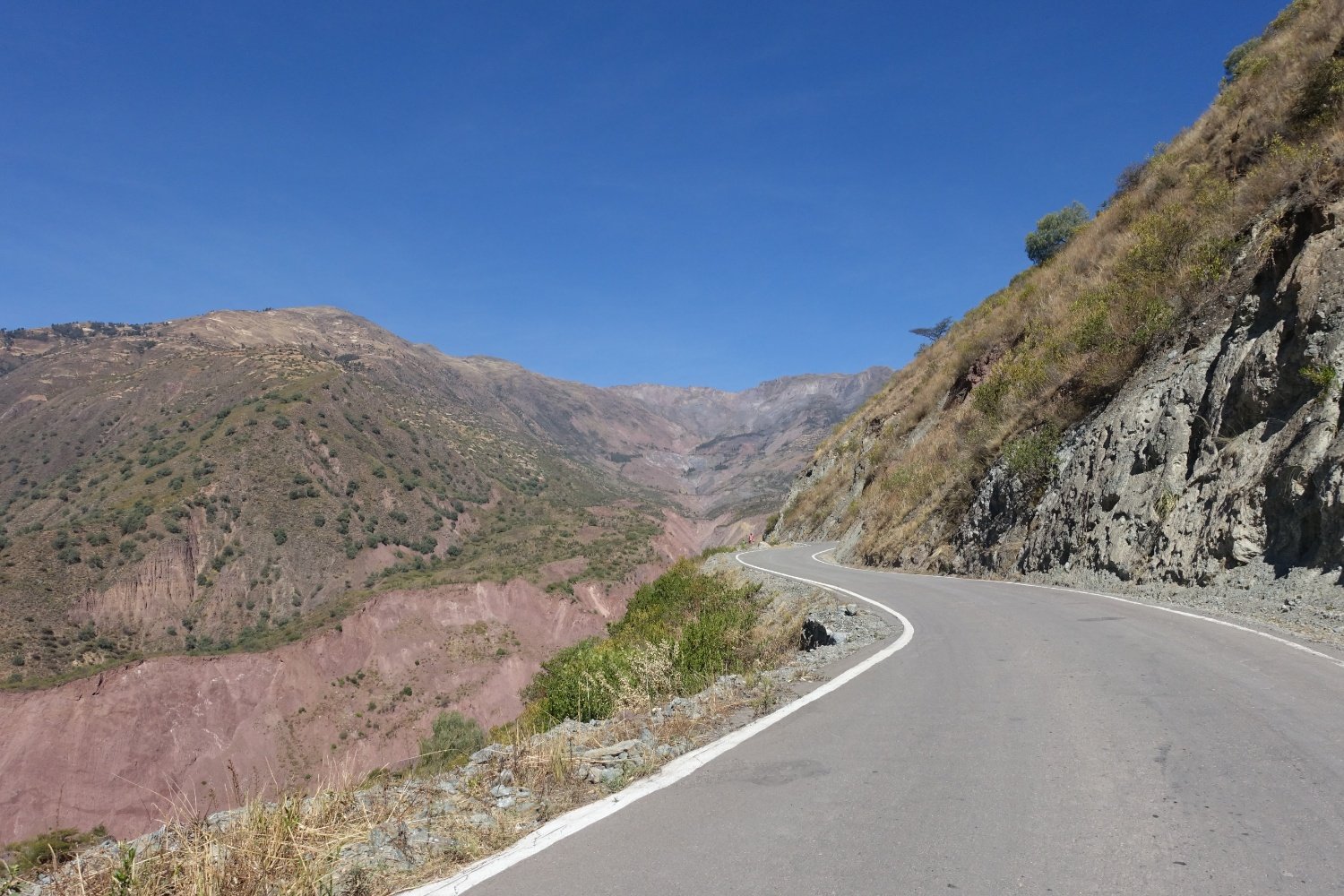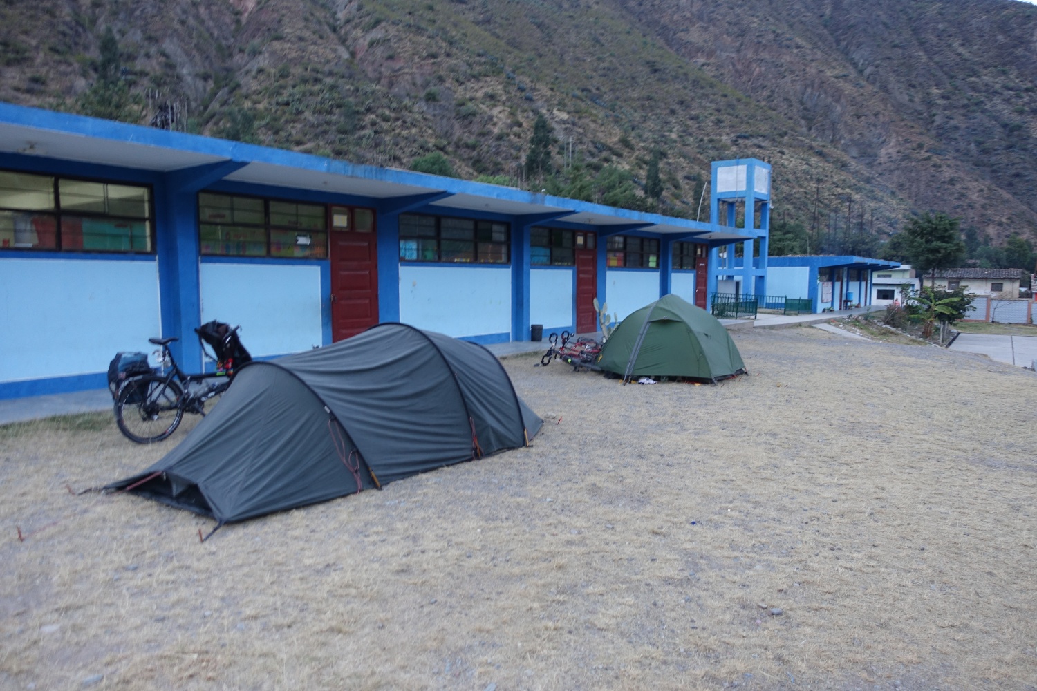 La vallée que nous traversons devient plus verte, la route longe toujours le flanc de coteau et monte et descend gentiment. Nous dormons à nouveau dans une école d'un charmant village.