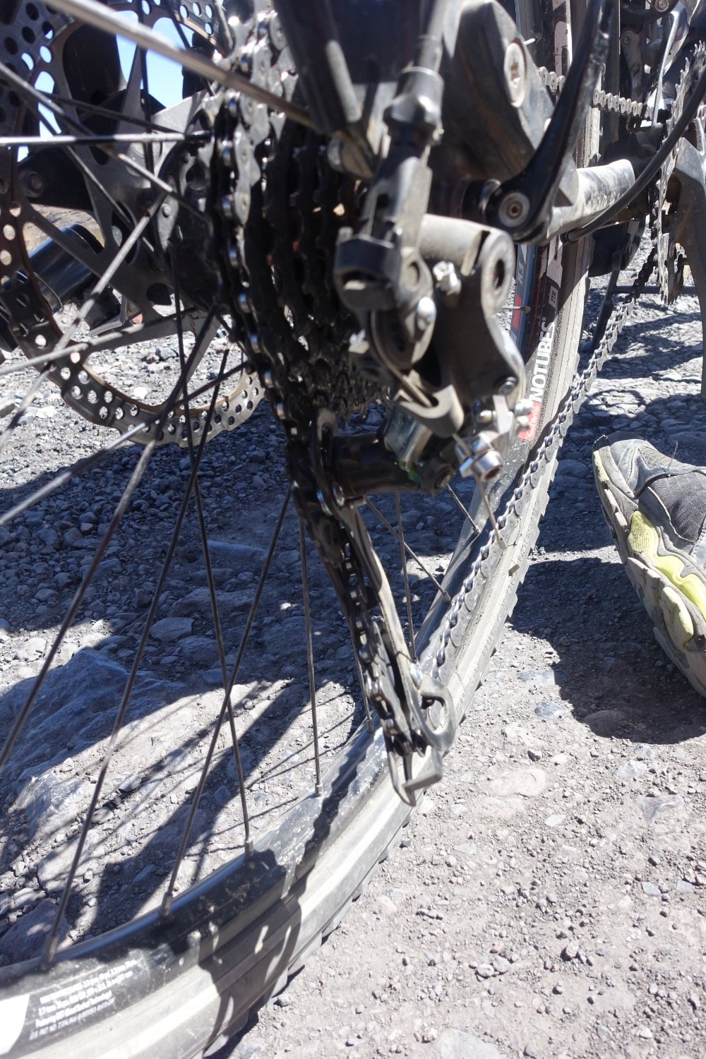 Résultat : lui et 5 maillons de chaîne sont cassés, quelques rayons abîmés. Nous remettons notre ancien dérailleur qui ne fonctionne pas bien et changeons la chaîne (par chance on en avait