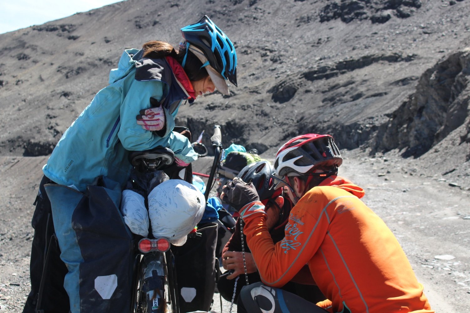très chaud, la route est à flanc de colline et bien évidemment personne n'habite dans le coin. On essaye de tout notre possible de remettre ce foutu pneu quand par chance un camion